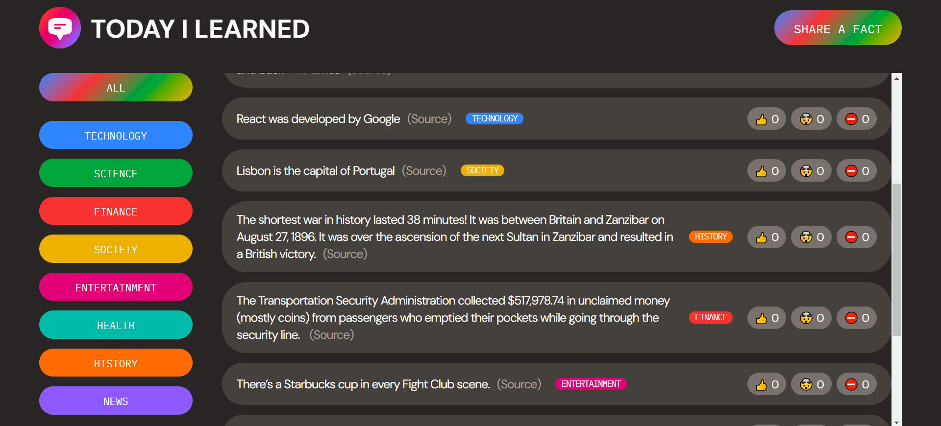 Today I Learned is a web platform utilizing React, allowing people to learn new facts from others while listing facts of their own.